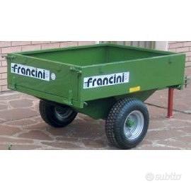 Rimorchietto monoasse per trattorini, tosaerba, quad e ATV con ribaltamento del pianale meccanico. CARATTERISTICHE TECNICHE: Dimensione pianale e sponde: 1,20x0,90x0,25 mt Tara: 85 kg Massa compl.: 400 kg Ruote: 16x6,50 - 8