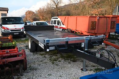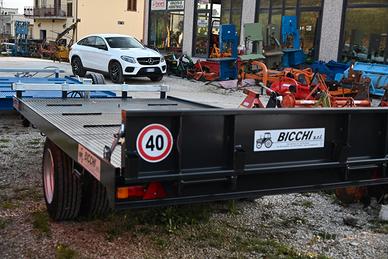 Carrellone multiuso Bicchi BP60MUL/B, con pistone anteriore con doppio effetto per inclinazione del pianale con rampa posteriore di salita con ruote gemellate , verricelli anteriori e laterali, freno idraulico azionato dal distributore del trattore.