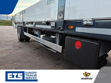 Rimorchio Carrellone nuovo di fabbrica Scorpion Versione con piano dritto N 3 Assi con freni a tamburo 12 pneumatici 245/70 R22.5 Sedi piantane Rivestimento pianale in gomma Rampe sdoppiate da 900 mm con centralina elettroidraulica Rampe traslabili Lunghezza pianale 8.3 MT Lunghezza totale 10 mt Sospensione pneumatica Cassettone porta sponde e piantoni ( optional) Traversa pareggiamento pianale (optional) Sponde in alluminio con piantoni estraibili per Timone con occhione per Campana automatica Ferma cingoli anteriori Pronta consegna