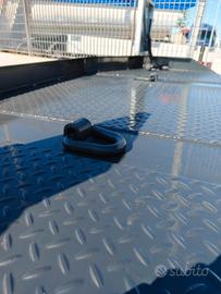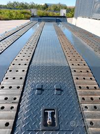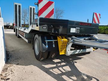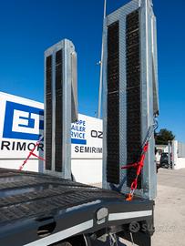 Rimorchio Carrellone nuovo di fabbrica Scorpion Versione con collo d'oca N°3 Assi con freni a tamburo Timone con occhione per campana automatica Lunghezza totale 10.20 mt Lunghezza Pianale 8.50 mt Rampe sdoppiate elettroidrauliche con traslatore Pianale rivestito in gomma antiscivolo ad alta trazione Allargatori per fuori sagoma con tabelle e lampeggiante Impianto frenante wabco Verniciatura di colore grigio Rampe e timone Zincati Pronta consegna