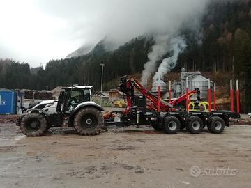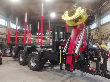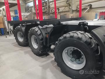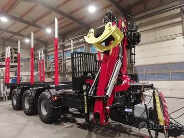 nuovo disponibile subito! secondo assale Agrodrive BPW trazione idraulica sospensione idraulica timone sospeso idraulico sterzatura elettroidraulica 340qli complessivo peso 110qli gru LIV130ZK da 10,5metri 1+3 assali BPW sterzanti e sollevabili freni 410x180 distanza tra gli assali 181cm sospensione regolabile , livellamento laterale impianto idraulico autonomo con pompa Load Sensing impianto luci led gomme 560/60R22.5 lunghezza pianale 740cm, per 2x tronchi da 4metri