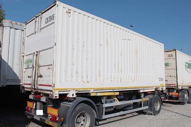 rimorchio porta casse mobili container merker usato, 2 assali con timone, telaio per alloggio container da 20 piedi e casse mobili da6.15m a 7.85m, cassa mobile compresa da 7.15m con porte posteriori, freni a disco, timone con occhione allungabile, anno 2013 -revisionato sino al 31.09.2026-CONCESSIONARIO INTERDRIVE SRL-PARMA