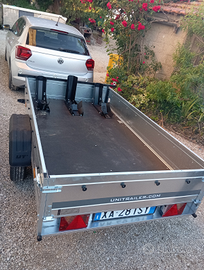 Rimorchio monoasse con timone basculante, superficie di trasporto: 230x125 cm, PTT fino a 750 kg. Completamente zincato. Ruotino. centina e telo incluse.