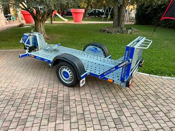Rimorchio MOTO ONE per trasporto MOTO con doppia rampa posteriore Usato come nuovo Dimensioni utili : 245 x 96 cm Dimensioni esterne : 370 x 135 x 100 cm MAssa complessiva 750 kg Portata utile 547 kg Tara 203 kg Ruote : 155/70 R13 Barra di torsione all'assale Altezza piano di carico 60 cm Telaio completamente zincato a caldo Doppia rampa di salita con piede d'appoggio, lunghezza 130 cm Supporto ruota moto con 16 posizioni regolabili 4 anelli di fissaggio a lato 1 cuneo ferma ruota con supporto spina 13 poli Visibile nella nostra sede in provincia di Modena Per maggiori informazioni o per fissare appuntamento per visione contattare in orari d'ufficio Action srl Tel
