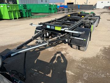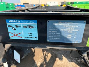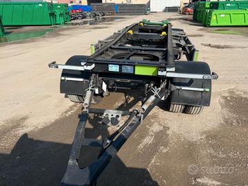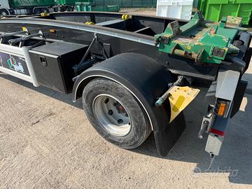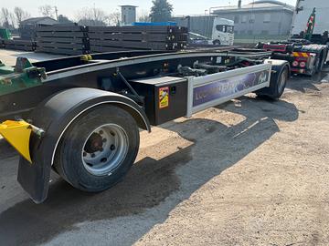 Rimorchio a due assi Targa: XA 038 WX Massa a pieno carico: 20000 Kg Idoneo a movimentazione di container con lunghezza max. 5.000 mm. o 7.000 mm. + INP200 Parte posteriore di carico con smusso per migliorare incarramento cassa Sistema di bloccaggio contenitori pneumatico con pinze interne Fermi meccanici rimovibili per diverse lunghezze cassone Telaio portante calandrato Impianto frenante con EBS Assali SAF con freni a disco Sospensioni pneumatiche Gommatura 265/70 R 19.5 Porta ruota di scorta a verricello + 2 cassette porta attrezzi Cunei e porta cunei montati. Anno di immatricolazione: 2023 Uso solo interno e manutenzioni costanti