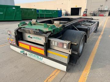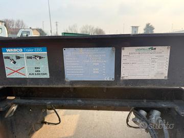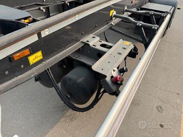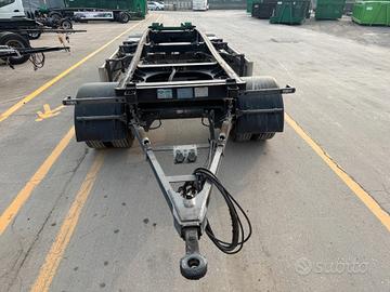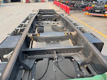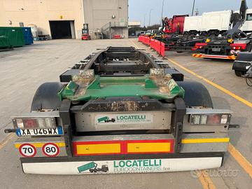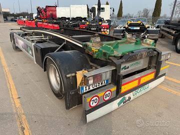Rimorchio a due assi Targa: XA 046 WX Massa a pieno carico: 20000 Kg Idoneo a movimentazione di container con lunghezza max. 5.000 mm. o 7.000 mm. + INP200 Parte posteriore di carico con smusso per migliorare incarramento cassa Sistema di bloccaggio contenitori pneumatico con pinze interne Fermi meccanici rimovibili per diverse lunghezze cassone Telaio portante calandrato Impianto frenante con EBS Assali SAF con freni a disco Sospensioni pneumatiche Gommatura 265/70 R 19.5 Porta ruota di scorta a verricello + 2 cassette porta attrezzi Cunei e porta cunei montati. Anno di immatricolazione: Dicembre 2023 Uso solo interno e manutenzioni costanti