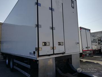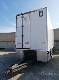 Rimorchio biga con 2 assi centrali, furgone isotermico ROLFO, misure esterne furgone: lungo 7690 e largo 2600, privo di ATP da farsi al CPA, gruppo motore frigo THERMO KING, pedana caricatrice retrattile DHOLLANDIA da 20 q.li.
