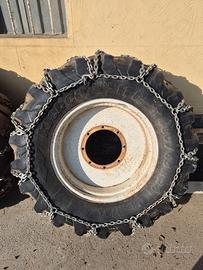 Vendo ruote trattore con cerchioni e catene da neve/forestali. Copertoni kleber misure 480/65 r28. Diametro mozzo cerchio 28.5 8 fori. Disponibili anche piastra pelazza per attacco lama da neve ed attacchi New Holland serie TM.