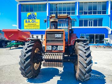 Motore: Same 6 cilindri Cilindrata: 6.231 Cavalli: 130 cv Anno: 1990 Cambio: meccanico a due velocità ed inversore meccanico laterale Trazione: 4 ruote motrici Traino: 50 q Velocità massima: 34 km/h Tara: 52 q Pneumatici: ant. 380/85R30 NUOVE e post. 460/85R38 NUOVE Cabina: climatizzatore, tettuccio apribile Distributori idraulici: 6 Accessori: parafanghi anteriori, zavorre, staccabatteria Condizioni generali: buone, tutto originale La Società BA.GI.SRL da' la possibilità di finanziare tutti i suoi mezzi fino ad un massimo di 50000€ per 5 anni