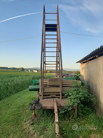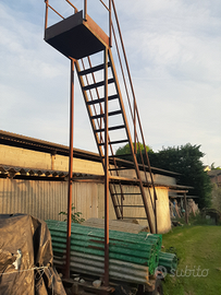 Scala carrellata con piattaforma e gancio di traino, completa di puntoni regolabili. Altezza circa 4 metri, peso 130kg, portata 340kg.