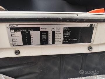 AUTOCARRO SCANIA G450 (COD.INT. PM1957) DESCRIZIONE - Autocarro in ottime condizioni generali, a telaio (possibilità di allestimento con pianale con rampe di carico nuovo metri 9), 3 assi, 6x2*4, terzo asse sterzante, cambio automatico, Euro 6, sospensioni full pneumatiche, retarder POSSIBILITA' DI FINANZIAMENTO Km n.d. Anno - 2014 Portata a pieno carico - 260 q.li Potenza netta - 450 cv - 332 kW Passo - 5700+1350 Cilindrata - 12.742 cm³ Prezzo : Euro 35.000,00 + IVA