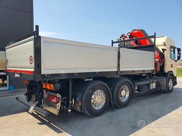 Scania G450 6x2 del 2019, Euro 6, cambio automatico con frizione, 266000 km circa, interni in pelle, completo di Gru retro cabina NUOVA DI FABBRICA di marca FASSI mod. F315B.2.25 e-dynamic, sfili 5+4, altezza massima 28 mt, stabilizzatori extra estensibili idraulicamente e rotanti, traversa supplementare idraulica, martinetti stabilizzatori corti, radio comando con display a colori, internet offcrane, scambiatore di calore, fari da lavoro, led, luci d'ingombro led stabilizzatori, luci d'ingombro led traversa posteriore, FSC platform stability control, cassone NUOVO DI FABBRICA ribaltabile trilaterale con sponde in alluminio tr5 altezza 0,80 mt, lunghezza 5,60 mt circa. Idoneo per pratica ZES SUD e industria 4.0.