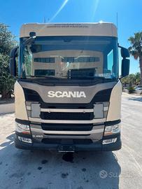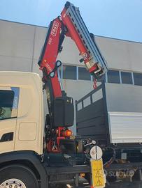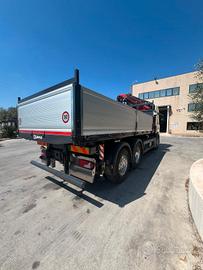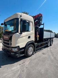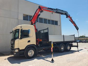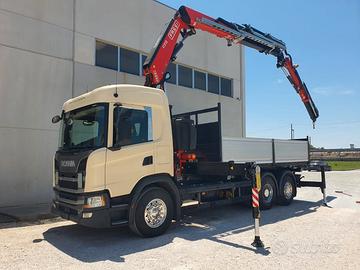 Scania G450 6x2 del 2019, Euro 6, cambio automatico con frizione, 266000 km circa, interni in pelle, completo di Gru retro cabina NUOVA DI FABBRICA di marca FASSI mod. F315B.2.25 e-dynamic, sfili 5+4, altezza massima 28 mt, stabilizzatori extra estensibili idraulicamente e rotanti, traversa supplementare idraulica, martinetti stabilizzatori corti, radio comando con display a colori, internet offcrane, scambiatore di calore, fari da lavoro, led, luci d'ingombro led stabilizzatori, luci d'ingombro led traversa posteriore, FSC platform stability control, cassone NUOVO DI FABBRICA ribaltabile trilaterale con sponde in alluminio tr5 altezza 0,80 mt, lunghezza 5,60 mt circa. Idoneo per pratica ZES SUD e industria 4.0.