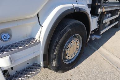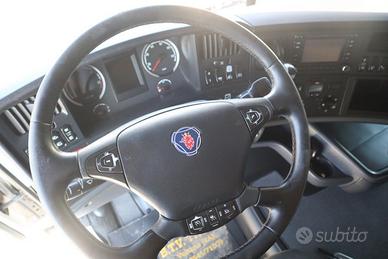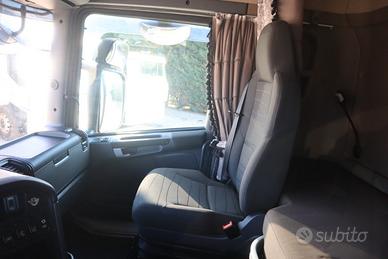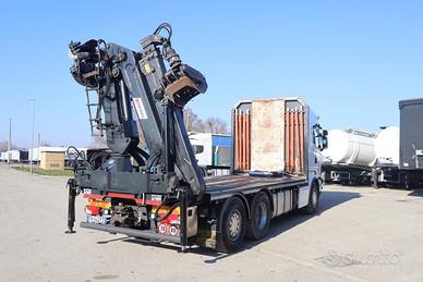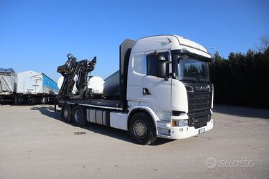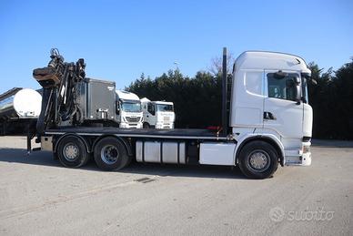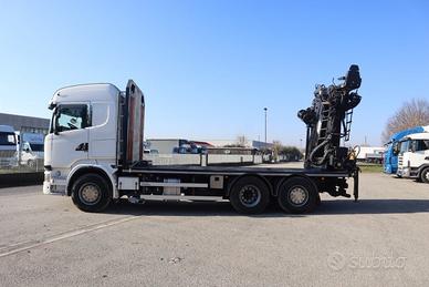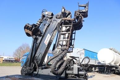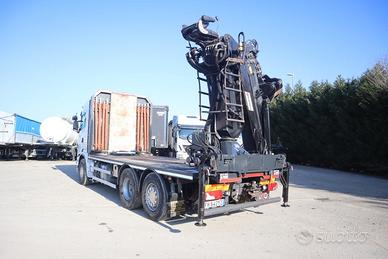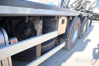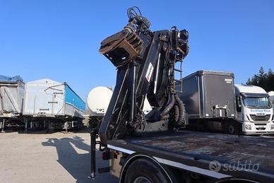 anno 2017, euro 6, km 790000, cambio automatico con retarder, 3° asse intelligente, gomme 385/65 r22.5 sul 1° e 3° asse e 315/80 nell asse traino al 605, passo 4300, cassone in ferro lunghezza utile 5,60m + piantane, full pneumatico, caricatore posteriore MARCHESI M12Z portata massima 2350kg, a 9m porta 1220kg, pinza per tronchi marca HULDINS SG 360 con rotore idraulico. Navigatore, clima da fermo, hill holder frigo in cabina, anticollisione, webasto. ottime condizioni generali
