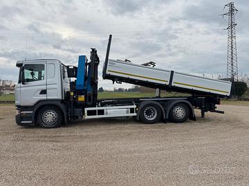 SCANIA R410, 6×2, euro 6, cambio automatico, gru Palfinger 27000 su ralla a 6 sfili idraulici + Jib a 2 sfili idraulici (28 metri altezza), doppia idraulica in punta sul Jib per pinza, ragno o rotore, forca rotante, 4 piedi stabilizzatori, radiocomando, cassone ribaltabile 3 lati da m 6,00 nuovo, sospensioni full pneumatiche, perfetto stato.