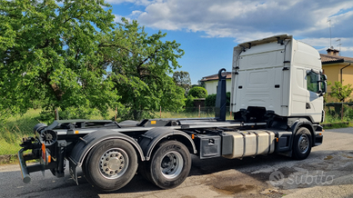 Vendo motrice Scania R 440 3 assi 6x2 con impianto scarrabile da 20 Ton.MOTORE E FRIZIONE NUOVI certificati da fattura Scania.Cambio automatico con frizione.Retarder.Anno 2009.Euro 5.Portata kg. 13.000.Km. 1.049.000.Passo 4.800 mm.Impianto scarrabile Ellermann HL 26.70S da 20 ton.Aggancia casse fino a 7,50 metri.Terzo asse intelligente sollevabile e autosterzante.Sospensioni posteriori pneumatiche.Traino posteriore per aggancio rimorchio.Prezzo netto i.e..Per info339 1952234339 5814237