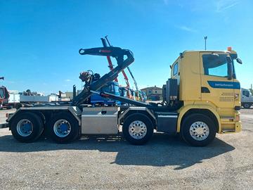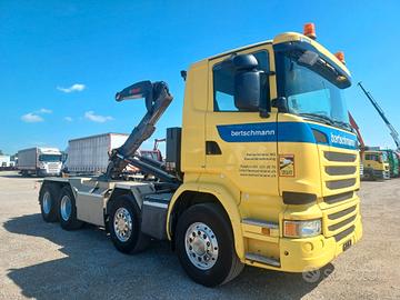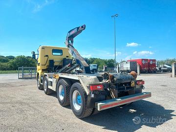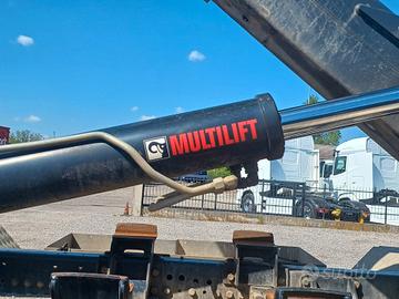 GENERALE: anno 2017, km 332500, classe emissione E6, cilindrata 12742 cc, potenza 331 kw (450 cv), peso totale a terra 32000 kg, passo 4200 mm, portata 18750, cambio automatico con frizione a 13 velocità. INTERNO: 2 posti in cabina, sedile conducente con braccioli, volante multifunzioni completo, cruise control e limitatore di velocità, radio cd, retrocamera, aria compressa in cabina, vetri e specchi elettrici, presa USB, presa 12 V. ESTERNO: cassetta porta attrezzi, cunei ferma ruote, 2 lampeggianti sul tetto. ALLESTIMENTO: impianto scarrabile MULTILIFT XR26Z per casse fino a 6,20 mt circa, impianto dotato di brandeggio, comandi in cabina, chiusura a forcella.