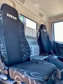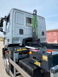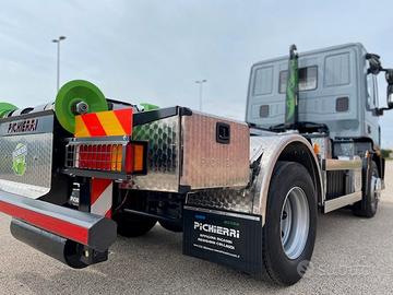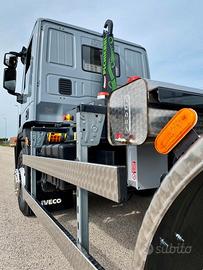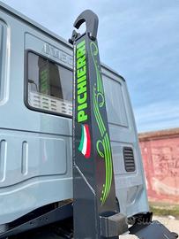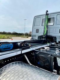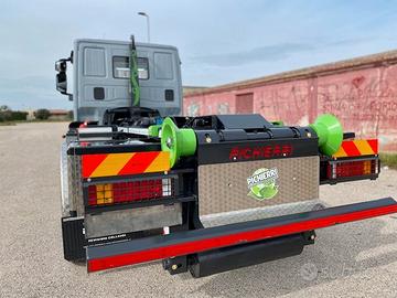 Allestito con parafanghi e cassette porta attrezzi inox fiorettato, paracicli in acciaio fiorettato con calzatoie yellow, applicazione cristallo posteriore cabina per maggiore visibilà durante l'esecuzione delle manovre incarramento, scarramento e ribaltamento.