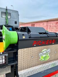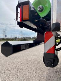 Attrezzatura costruita in acciaio alto resistenziale STRENX 700, rullo stabilizzatore verticale, rulli in acciaio registrabili avanzamento cassa, pompa idraulica a pistoni e presa di forza BEZARES, distributore oleodinamico comando esterno VALVOIL.