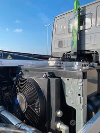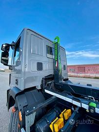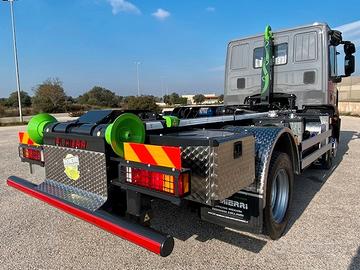 Allestito con parafanghi e cassette porta attrezzi inox fiorettato, paracicli in acciaio fiorettato con calzatoie yellow, applicazione cristallo posteriore cabina per maggiore visibilà durante l'esecuzione delle manovre incarramento, scarramento e ribaltamento.
