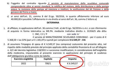 Come desumibile dalladocumentazione probatoria allegata, a c.a. 446.000 km, l'amministrazione haeseguito una manutenzione straordinaria dell'automezzo con un costo pari a €6.549,00, effettuando i seguenti interventi: Rettifica del motore, revisionepompa e iniettori, sostituzione kit frizione, distribuzione e pompa dell'acquae ganasce freno a mano.