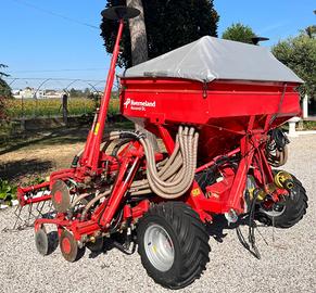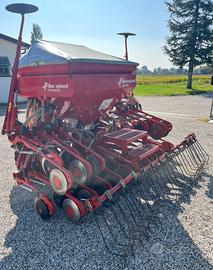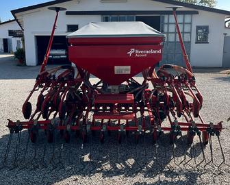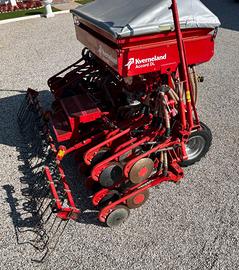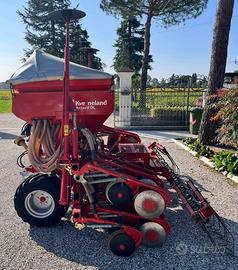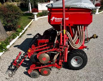 Seminatrice Kverneland DL 4,5m con 32 file, interfila 14cm, ingombro 3m, pieghevole idraulica, segnafile idraulici con valvola di scambio, elementi cx con disco in acciaio e disco pulitore in gomma, rialzo tramoggia, coppia rompitraccia sulle ruote, erpice copriseme con molle a s da 10mm, cardano con ruota libera, kit luci, monitor signus di kverneland (contaettari totale e parziale, allarme esaurimento seme in tramoggia, velocità avanzamento, velocità ventola, predisposto anche per regolazione quantità seme elettrica, prova di taratura elettrica, interruzione semina elettrica e tracciapassaggi), manuali e conformità ce. Peso 900kg