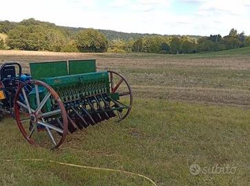 Seminatrice a traino, regolabile per quantità seme, larghezza interfila e velocità. Larghezza massima lavorazione 1.75 è stata usata per grano, ceci, lenticchie e piccoli fagioli. Meccanica semplice e robusta.