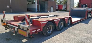 Semirimorchio a culla allungabile 3 assi. Allungamento 4200. Sospensioni pneumatiche. 1° asse fisso, 2° e 3° autosterzanti con bloccaggi indipendenti. Rampe amovibili. Perno 2", altezza piatto ralla 1250 mm. Massa legale. Appena revisionata. Lunghezza parte bassa 5200 + allungamento 4200, altezza 320 mm. Lunghezza gruppo assi 4300, altezza 900. Euro 30000 trattabili + IVA.