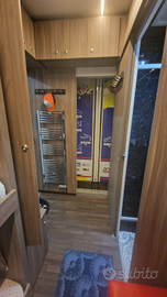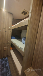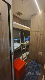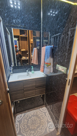 Inoltre è provvisto di un vano dove vi è un frigo professionale, pensili, lavello in acciaio inox,e ghiacciaia, nella parte inferiore vi sono molti gavoni capienti, provvisto di impianto elettrico a 380v, 220v, 24v e 12 v, sul tetto è stato fatto il trattamento membrapol, che evita infiltrazioni per decine di anni, e il telaio è stato tutto trattato con la cera oleosa per evitare la ruggine anche a distanza di anni.