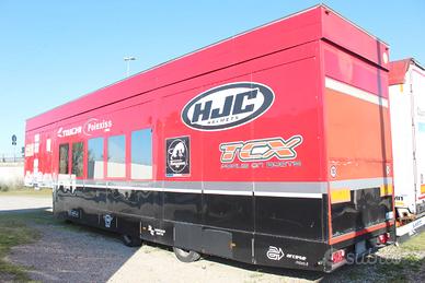 sem hospitality adibito ad uffici e visione, telaio zorzi collo d'oca anno 1994, allestimento racing anno 2012, tetto alzabile elettro idraulicamente per secondo piano calpestabile ed allestito, porte laterale , apertura posteriore, gavonatura laterale, piano base allestito con 3 stanze arredate, sospensioni pneumatiche, buone condizioni, CONESSIOANRIA INTERDRIVE SRL-PARMA