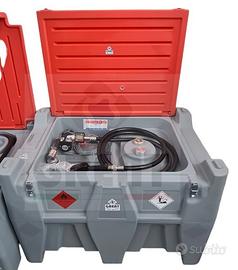 Realizzato con materiale plastico di grosso spessore, dotato di coperchio per evitare furti con chiusura a chiave, gruppo erogatore da 12v o 24 v, portata 40 lt/min, tubo 4 mt, pistola automatica con conta litri digitale, pinze collegamento a batteria, coperchio con chiusura a chiave.