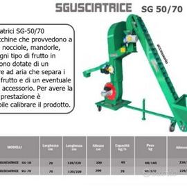 Le sgusciatrici SG-50 sono macchine che provvedono a sgusciare nocciole, mandorle, noci ed ogni tipo di frutto in guscio. Sono dotate di un separatore ad aria che separa i gusci dal frutto e di un eventuale elevatore accessorio. Per avere la massima prestazione è consigliabile calibrare il prodotto.