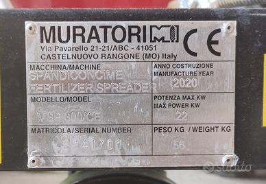 Vendo spandiconcime MURATORI MSP 300/CE praticamente nuovo con attacco a 3 punti; tramoggia in acciaio lt. 250, carico Kg. 325; disco spargitore zincato a caldo; alette spargitrici e portine in acciaio inox; deflettore in acciaio inox; agitatore fisso, griglia di sicurezza; albero cardanico.