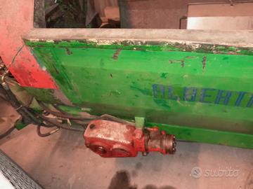Spandiletame marca Albertini da vigneto o frutteto- misure del cassone 2,70m x 1,15m- lunghezza timone 1,10m- anno 2002- capacità 40 quintali- spargimento laterale con regolazione idraulica del piattello- targa e libretto- in buone condizioni. Avanzamento idraulico del tappeto e pulsantiera comandi elettrica. Frenatura idraulica.