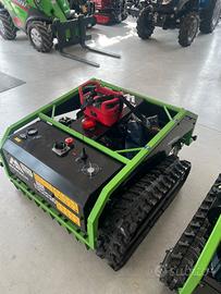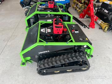 Tagliaerba trinciasarmenti MOMACH MM55A radiocomandato. Trazione con cingoli per affrontare le pendenze in sicurezza, due coltelli rotanti che tagliano per una larghezza di 55cm e altezza taglio regolabile da 3 a 12 cm. Macchina ibrida che combina un motore a benzina per l'azionamento dei coltelli di taglio con due motori elettrici brushless per l'azionamento dei cingoli