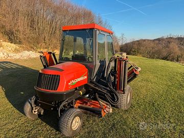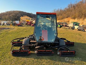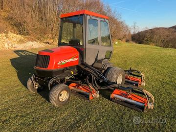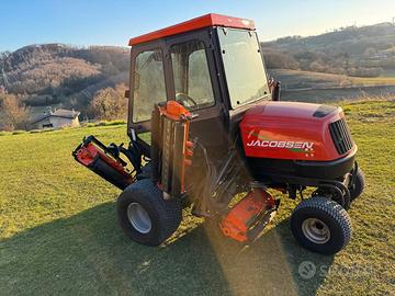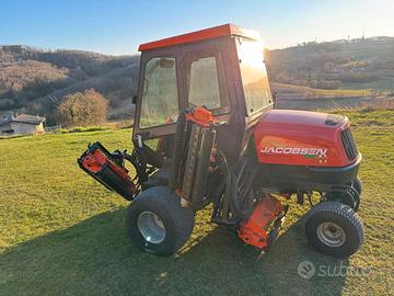 JACOBSEN 405 4WD COMPLETA DI CABINA CON APERTURA FACILITATA E PORTE RIMOVIBILI, settupla semovente per fairway di tipo medio, Motore diesel turbo Kubota 4 cilindri TURBO - Potenza max 52 HP (nominale 47 HP). Trazione idrostatica sulle quattro ruote ad inserimento automatico in taglio. Sollevamento/abbassamento ed azionamento teste di taglio mediante comando unico a leva. Comando regolazione pressione al suolo teste di taglio. Comando regolazione velocità battuta cilindro elicoidale. Servosterzo. Sedile ergonomico. Carrozzeria in ABS. Velocità fino a 24 km/h. Completa di teste elicoidali a 11 lame (diam. 6.5"). Rulli posteriori in acciaio pesante. Rulli anteriori a dischi da 3". Sistema regolazione messa in taglio con doppio registro a scatto. Sistema regolazione veloce altezza taglio da 9.5 a 38mm. Carreggiata ruote anteriori, con gruppi elementi laterali sollevati (e dentro all'ingombro) 230 cm. Puliscirullo posteriori a cavo e anteriori a pettine. Larghezza taglio 400 cm.