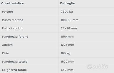 Ruote robuste - Dotato di una ruota motrice di 180x50 mm e rulli di carico di 74x70 mm, garantisce una movimentazione fluida su varie superfici.