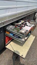 Attrezzato con scomparti e cassettiere laterali per trasportare moltissimi ricambi, inclusi compressore e verricello.