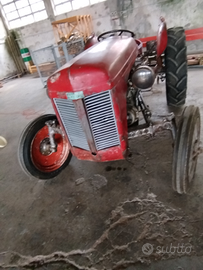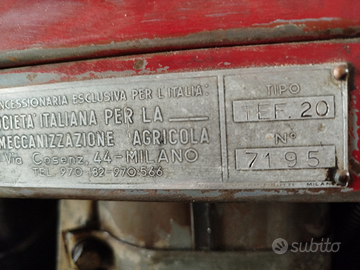 Vendo trattore agricolo Massey Ferguson anni 50/60 TEF-20 senza documenti. Tutte le parti di carrozzeria sono senza ammaccature. Fari anteriori e luci posteriori d'epoca. Motore funzionante. Presa di forza, sollevatore, motorino d'avviamento rigenerato. Gomme anteriori nuove. Erpice con 9 piccoli vomeri.