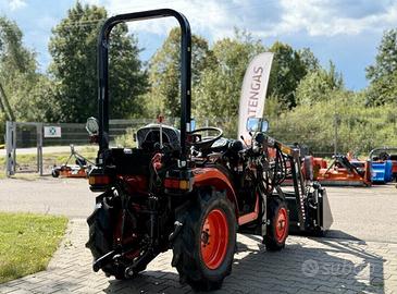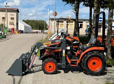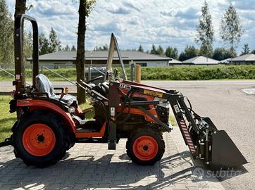 Dotato di cambio manuale 9+3, PTO 540/1000 giri/min, sterzo idraulico, sollevatore a 3 punti Cat. 1 con capacità di circa 300 kg, pompa idraulica da 25 l/min. Caricatore frontale incluso, capacità di sollevamento 150 kg. Peso complessivo circa 815 kg.