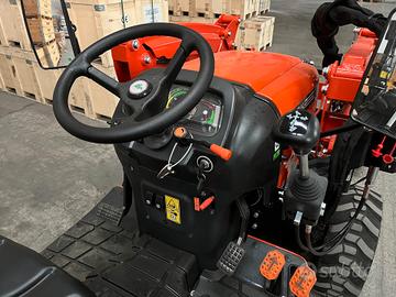 Il prezzo include il trattore mod. TAFE 6028H idrostatico, con ruote industriali ( o radiali, o garden) e pala frontale con benna 120cm a mordente ed auto livellante.