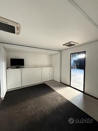 Truck bianco pellicolato nero opaco, con cellula espandibile idraulicamente, superfice a gavoni aperti circa 14 Mq, pannelli solari, due motogeneratori, impianto di domaotica Victron, batterie al litio, martinetti idraulici di autolivellamento e doppio condizionatore.