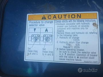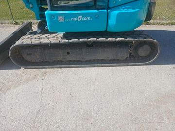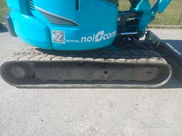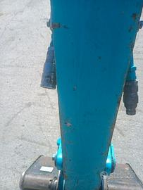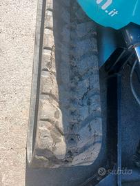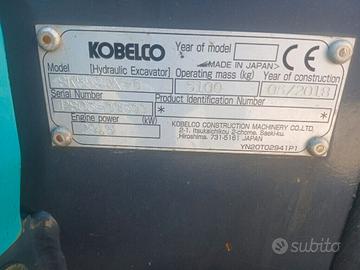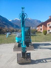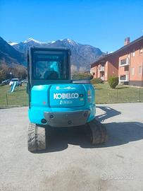 Miniescavatore Kobelco mod. SK55SRX-6, girosagoma, doppia velocità , cabina, aria condizionata, cingoli in gomma, braccio lungo, impianto proporzionale martellone idraulico, contrappeso supplementare, valvole di blocco su cilindro braccio sollevamento e braccio penetratore, gancio su biella rovescio benna, attacco rapido Klac E.