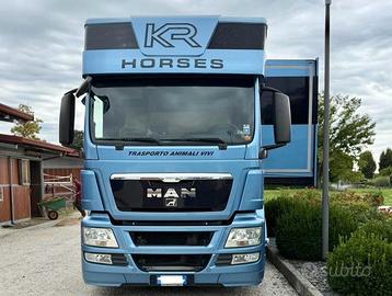 Camion Man TGS 26.400 del 2012 con 206.000 km, uso speciale, cambio automatico, cabina ribaltabile, full pneumatico, gancio di traino, etc..Allestimento a Krismar per il trasporto di N.6 cavalli. Dotato di ascensore esterno, n.2 pedane manuali di carico/scarico, luci diurne e notturne, ventole, telecamere di video sorveglianza, etc..Living full optional con popout e push up. Dotato di bagno con box doccia separato, aria condizionata, tv con antenna, etc..