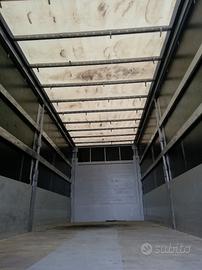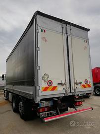 Telaio con twist-lock per casse intercambiabili, cassone centinato mt. 7,40 con 2 porte posteriori, 2 sponde per lato H800, alzabbassa, tetto copriscopri, cambio marce automatico, freno Retarder, CE EURO 3.