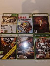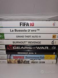 8 giochi per Xbox360 di seguito elenco: RESIDENT EVIL 5 GTA IV RAGE ANARCHY RAPALA GEAR OF WAR BURNOUT REVENGE FIFA 10 LA BUSSOLA D'ORO