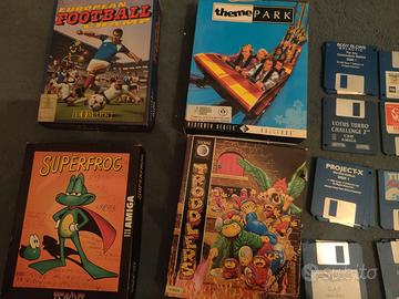 giochi con scatola: theme park, european football champ, superfrog (scatola con scritte sopra)