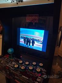 Vendo Mini Cabinato Arcade progettato come un Videobox Musicale. Formato da una PS3 all'interno, e in grado di riprodurre foto, musica, video e giochi tramite il lettore. Periferiche di collegamento, AUX, USB, WI-FI, BLUETOOTH. Grazie alla memoria interna sono presenti oltre 1000 video musicali utilizzando meno della metà della memoria disponibile sull' Hard Disk. WOOFER da 30cm presente nella parte sottostante , lateralmente sono presenti casse a 2 vie da 150w. Schermo da 10" TFT con telecomando in Full HD protetto da un vetro temperato di 10mm , collegamento HDMI, VGA e ANTENNA . DECODER DIGITALE INTEGRATO.