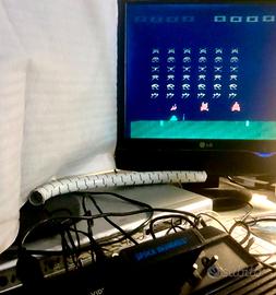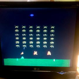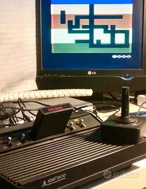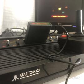 Atari 2600 Vader nero anni 80, testato e perfettamente funzionante, con confezione originale, alimentatore, 1 joystick originale (con guaina scollata ma funzionante) e 4 cartucce di giochi nelle confezioni (Space Invaders, Ms Pacman, Dig Due e Tutankham).