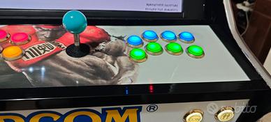 Bartop, gioco arcade da bar, base da appoggio cm 70L 64H 48P. Doppio giocatore con 8 tasti dedicati ognuno, più tasto crediti e start. TV led 24 pollici collegata in HDMI, 2 porte USB esterne per collegare eventuali joypad esterni e tastiere. Ventole di raffreddamento, materiale mdf. All'interno Raspberry 3B con batocera 41 con 10.000 giochi all'interno in una microSD da 128 GB.